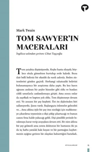 Mark Twain’in en sevilen yapıtlarından biri olan Tom Sawyer’ın Maceraları çocukluğun masum, güvenli ve olağanüstü maceralarla dolu evrenine bir övgüdür. Roman Mississippi Nehri kıyısındaki küçük bir kasabada, belirtilmeyen bir dönemde geçer. Ancak okur evlerde siyahi kölelerin bulunmasından hikayenin 1830’larda ya da 1840’larda geçtiği sonucuna varabilir. Herkesin herkesi tanıdığı, yetişkinlerin çocukları eğitmek ve disipline sokmak için birlikte çalıştıkları bu küçük kasabada, herkes göründüğü gibi midir? Roman insan doğasının ikiyüzlülüğünü, bencilliğini, maddi değerlere düşkünlüğünü ve Amerikan taşrasındaki küçük kasaba ruhunu mükemmel biçimde yansıtır. Twain, iyi kalpli, ancak her daim haylazlık peşindeki Tom ve arkadaşlarının maceralarını gerçekçi bir dille aktarırken, alışılmış terbiyeli ve örnek çocuk imgesini de yıkar. Yapıtın kuşaklar boyu her yaştan okura hitap etmesinin sırrı, belki de çocuk aklının nasıl işlediğini bize hatırlatmasında; yetişkin dünyasından ansızın çocukluğa ışınlanmanın paha biçilmez değerinde yatar.