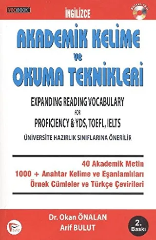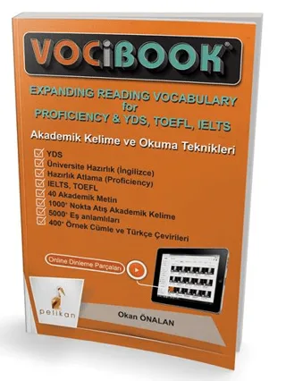 Kitabın en önemli özelliklerinden biri, parçaları değişik alıştırmalarla okuyucuya tekrar ettirmesi ve her bir çalışmada anlamayı ve okuma hızını geliştirmesidir. İngilizcesini geliştirmek isteyenler ve İngilizce sınavlara hazırlananlar, kitabın sonunda hem okuma becerilerini hem de kelime bilgilerini ileri düzeye ulaştırabilirler. Kitabın başında ve sonunda 160 soruluk iki kelime testi bulunmaktadır. Baştaki testi kitabı çalışmadan önce, sondakini ise kitabı bitirdikten sonra yaparsanız aradaki gelişmeyi kendi gözlerinizle göreceksiniz. Önceki kitabımızın önsözünde de söylediğimiz üzere, İngilizce sınavlarda başarının en önemli anahtarları kelime bilgisi ve okuduğunu anlama becerisidir. Kelime bilgisi okudukça gelişir, okuduğunu anlama ise kelime bilgisi arttıkça kolaylaşır. VociBook Serisindeki bu ikinci kitapta amaçlanan hem genel İngilizce Yeterlik (Proficiency), hem de İngilizce sınavlara (YDS, LYS-5, TOEFL, IELTS, Üniversite Hazırlık Atlama) yönelik olarak, kelime bilgisini artırmak ve okuma becerisini geliştirmektir. Bu maksatla, hedef kelimeler, örnek cümleler ve metinler, farklı alanlardan (Sosyal Bilimler, Sağlık, Ekonomi vs.) özenle seçilmiş ve cümlelerin Türkçe çevirileri sunulmuştur. Hedef kelimeler, eşanlamlıları (synonyms) ile güçlendirilmiş ve çalışmalarla desteklenmiştir. Çoktan seçmeli kelime soruları sınavlara hazırlıkta yol göstericidir. Tüm İngilizce sınavların temel mantığını oluşturan okuduğunu anlama becerisi ve sınav tekniklerine alıştırmak için alıştırmalar (True/False, Reference, Inference ve Cloze Test) eklenmiştir. Ayrıca, yine bu maksatla metinlerde ön plana çıkan dilbilgisi (grammar) yapıları, açıklamalar ve çeşitli çalışmalar (Restatement, Multiple Choice) ile pekiştirilmiştir. Kitabımız, her türlü İngilizce sınava hazırlanan, ileri düzeyi hedefleyen ve okuma metinleri ile kelime çalışmalarını bir arada bulmak isteyen tüm adayların çalışmalarına yön vermek için hazırlanmıştır.